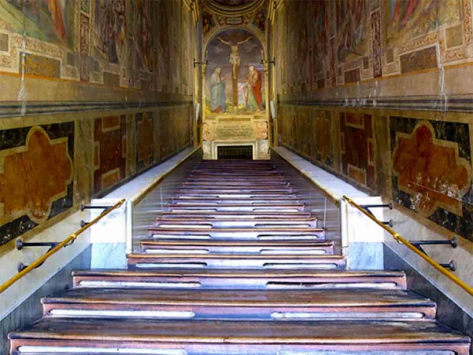 Las escaleras de mármol fueron llevadas a Roma desde la ciudad de Jerusalén por mandato del emperador Constantino y, según la leyenda, cubiertas con tablas de madera para protegerlas de los peregrinos y su desgaste por el uso.