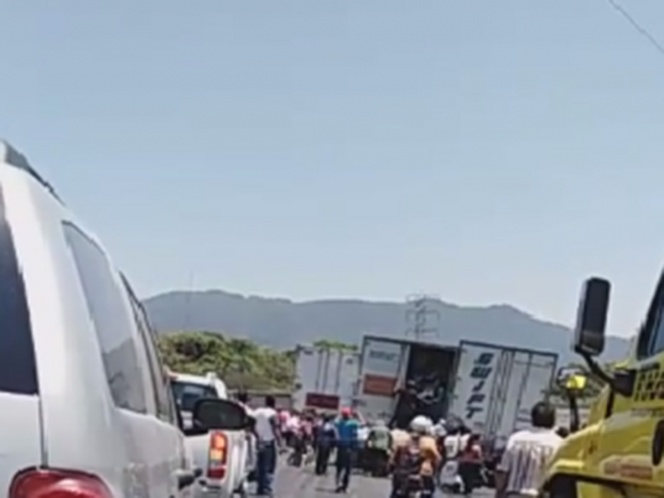 Al ver el accidente, un grupo de personas se aproximó a uno de los tráileres y comenzó a romper los sellos para sacarle la mercancía que llevaba.