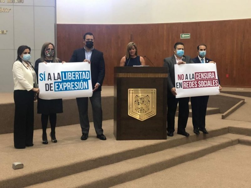 En su intervención, fue acompañada por cinco diputados y diputadas del PAN que desde el frente del salón de plenos desplegaron pancartas en las que se leía “Sí a la libertad de expresión” y “No a la censura en redes sociales”.
