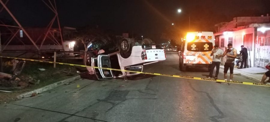 Volcada con las llantas hacia el cielo, quedó una camioneta Ford Ranger después de ser impactada por un automóvil en fuga, impacto que la proyectó contra la contención de una torre de alta tensión de la Comisión Federal de Electricidad, hecho en el que su tripulante resultó con lesiones que por fortuna no fueron de gravedad.
