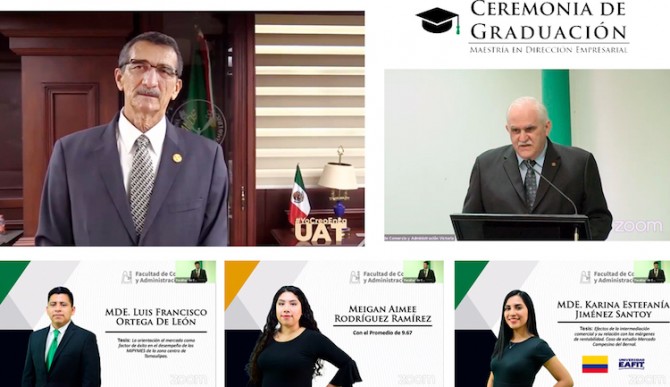 El Rector de la Universidad Autónoma de Tamaulipas (UAT), Ing. José Andrés Suárez Fernández, presidió la ceremonia virtual de graduación de la XIII Generación de la Maestría en Dirección Empresarial que se imparte en la Facultad de Comercio y Administración Victoria (FCAV).