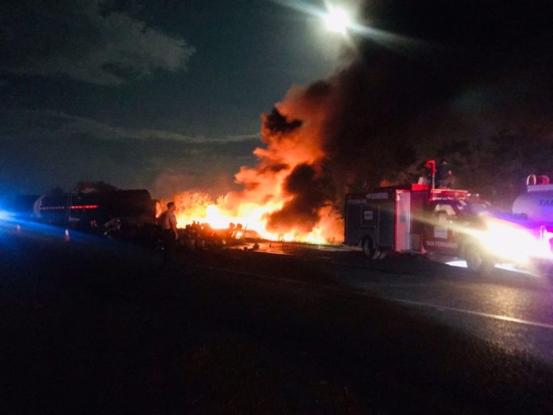 Un fuerte choque entre tres pipas provocó una gran explosión que dejó como saldo dos personas muertas y una más con graves lesiones durante la noche.