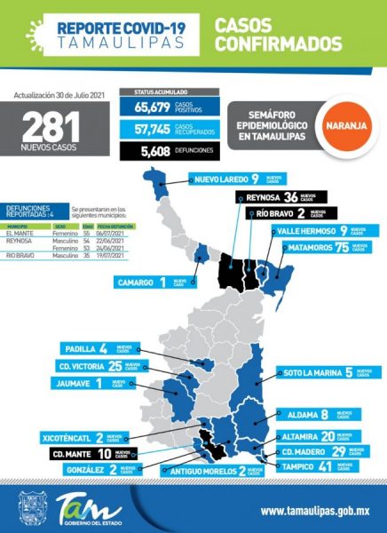 Ante el aumento en el número de casos de COVID-19 y la circulación de las diferentes variantes que son aún más contagiosas que la cepa original, la secretaria de Salud de Tamaulipas Gloria Molina Gamboa insistió en la importancia de atender en todo momento las 6 medidas básicas de seguridad sanitaria contra el virus que son: Uso del cubrebocas, Mantener una distancia mínima de 2 metros con otras personas, Lavado correcto de manos y uso frecuente de alcohol gel, Hacerse la prueba, Aislamiento de casos positivos y Evitar asistir a reuniones sociales, a fin de disminuir el impacto de la pandemia.