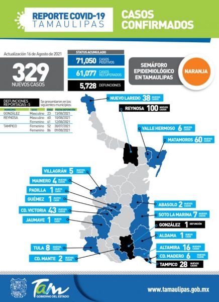 Luego de insistir en su llamado a la población a no bajar la guardia ante el #COVID19, respetar las disposiciones gubernamentales y acudir a vacunarse para disminuir el impacto de la pandemia, la secretaria de Salud de Tamaulipas, Gloria Molina Gamboa confirmó 329 nuevos casos y 5 defunciones asociadas a complicaciones graves por la enfermedad. Aseguró que el uso del cubrebocas en todos los espacios públicos, el lavado frecuente de manos, la sana distancia y quedarse en casa el mayor tiempo posible, representan la forma más efectiva de desacelerar la transmisión del virus y avanzar a la nueva normalidad.