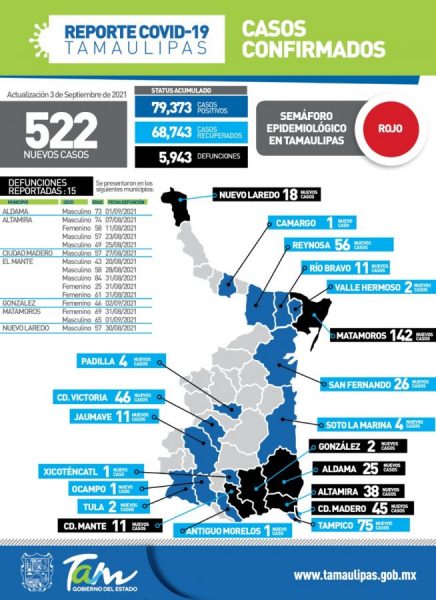 La secretaria de Salud de Tamaulipas, Gloria Molina Gamboa advirtió que la emergencia sanitaria por COVID-19 continúa activa y que el semáforo epidemiológico continúa en rojo, es decir, en riesgo máximo, por lo que pidió a la sociedad ser ciudadanos socialmente responsables y evitar fiestas, salidas no esenciales y aplicar las medidas de prevención ya conocidas.