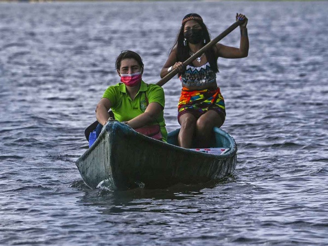 El viento en contra le da más trabajo a Madelaine, una indígena de 25 años que, con su remo, dibuja ondas sobre el agua. Amaneció hace poco, el río está calmo, el cielo azul y las nubes aparecen en un paisaje limpio, como una fotografía en alta definición.