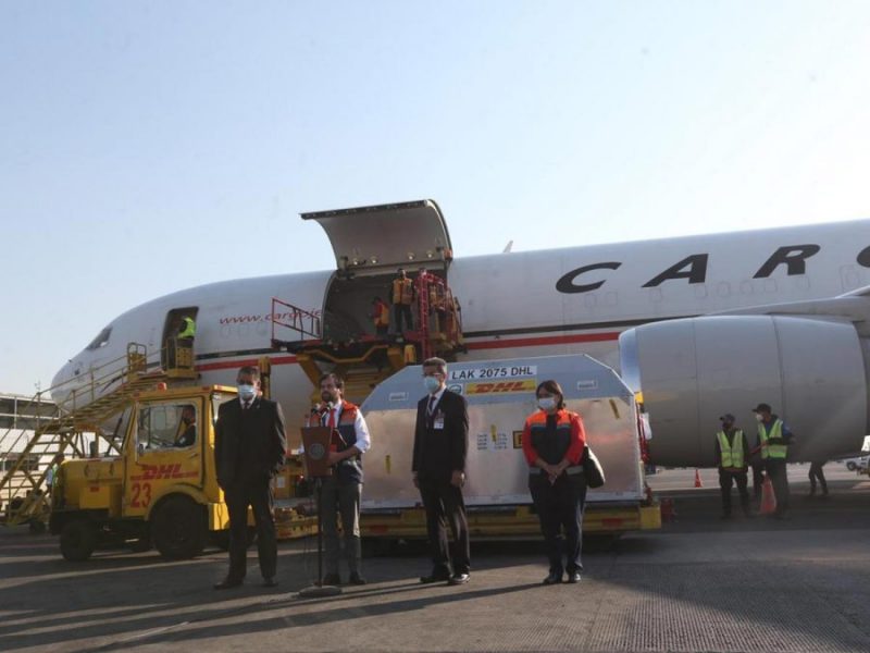 En punto de las 8:00 horas aterrizó en el AICM el avión de la empresa Cargo Jet, matrícula C-FMIJ, que se trasladó a la plataforma remota 42, en donde el personal de apoyo en tierra descargó el contendor LAK 2075 DHL, con las dosis destinadas para la capital del país.
