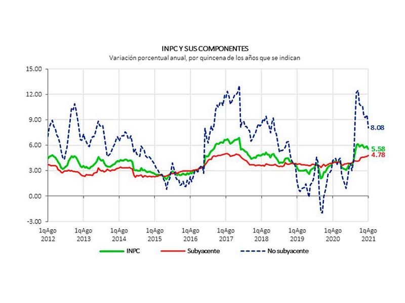 El índice de precios al consumidor avanzó a un 5.58 por ciento desde el 5.86 por ciento registrado en la segunda quincena de julio, dijo el martes el instituto de estadística INEGI, por lo que siguió superando la meta del banco central. Analistas proyectaban que la inflación quincenal se moderara a un 5.74 por ciento.