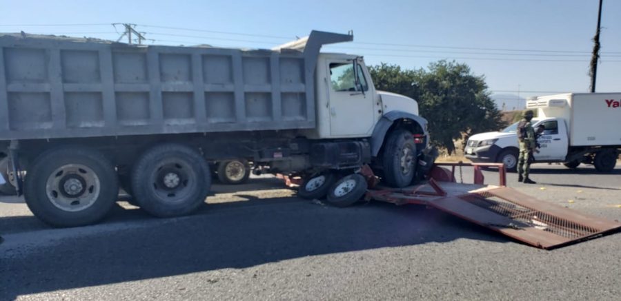Presuntamente el conductor de una camioneta Ford-F150 remolcada con una traila, intentó dar una vuelta en un lugar prohibido y fue impactada por un camión tipo Torton, el cual quedó trepado en la traila que transportaba tambos de 200 litros.