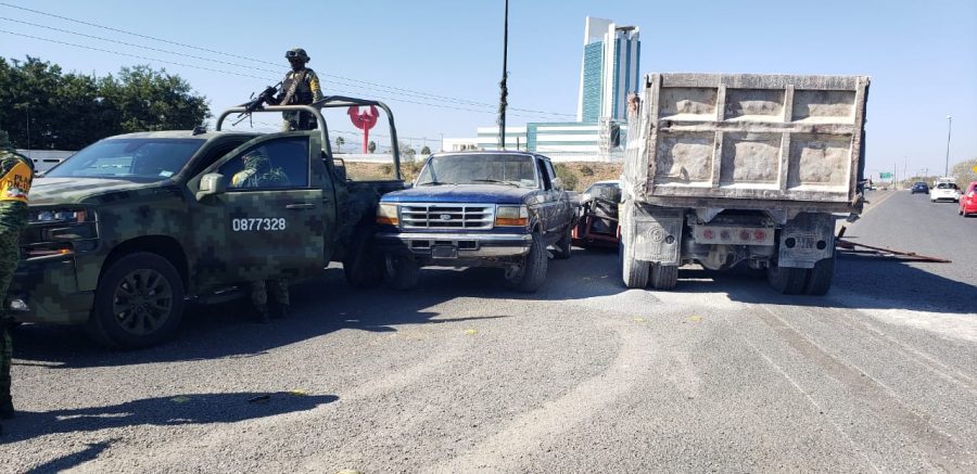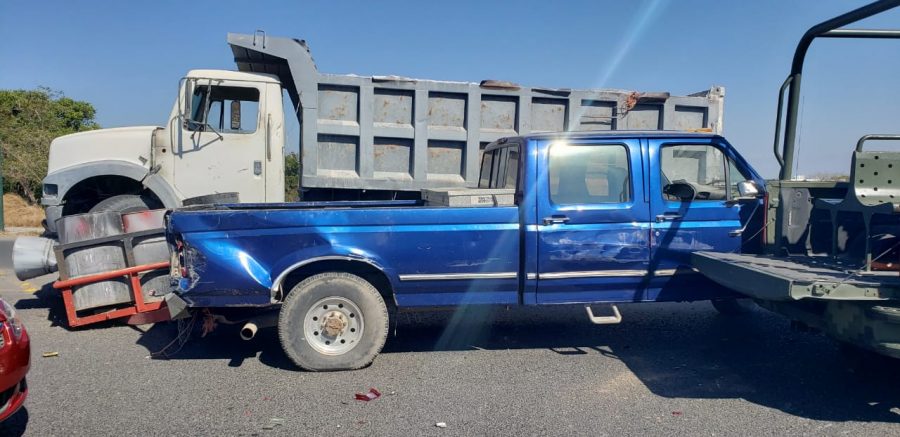 Tras el percance, una unidad de la Secretaría de la Defensa Nacional (Sedena) resultó daños en un costado, causados por la camioneta Ford F-150.