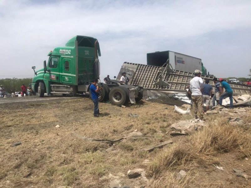 El tracto camión de la empresa Transportes Urgentes Nuevo León, quedó convertido en chatarra al igual que la caja que quedó volcada.