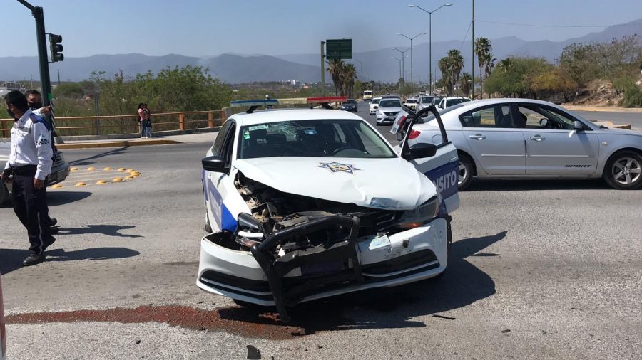 Una elemento de Tránsito local resultó lesionada esta mañana luego de que la unidad en la que viajaba chocó contra un patrulla de la Policía Estatal, en el crucero de la avenida La Paz y el “Puente de la Moderna”.