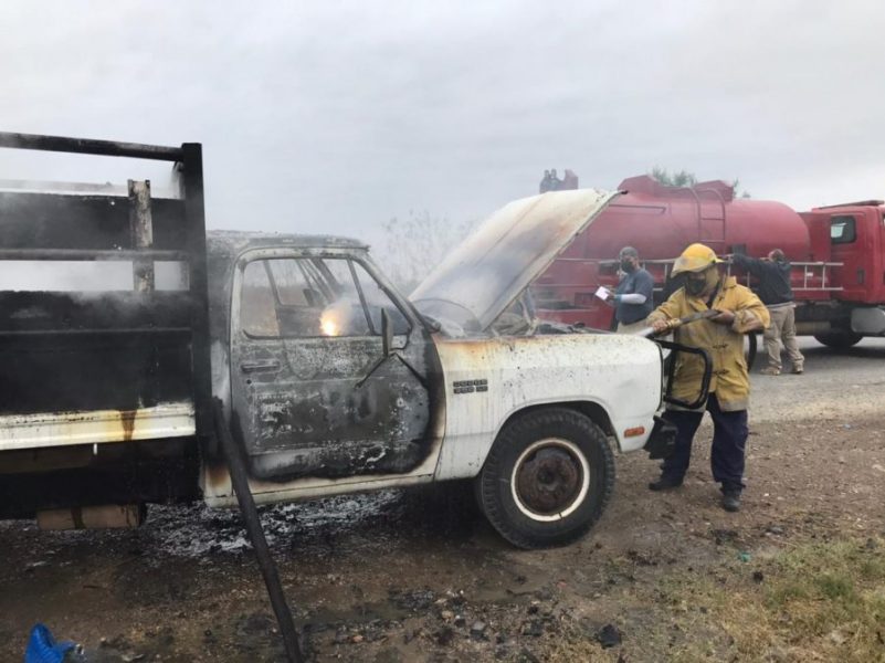 El chofer del camión Dodge de redilas nada pudo hacer para evitar el incendio y solo observó cómo su herramienta de trabajo era consumida por las llamas producto de una negligencia.