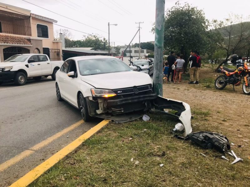 La falta de pericia al volante y el probable exceso de exceso velocidad de un conductor, provocó que perdiera el control de su auto y se estrellara contra una luminaria al intentar evitar golpear a un ciclista, resultando él y su esposa lesionados.
