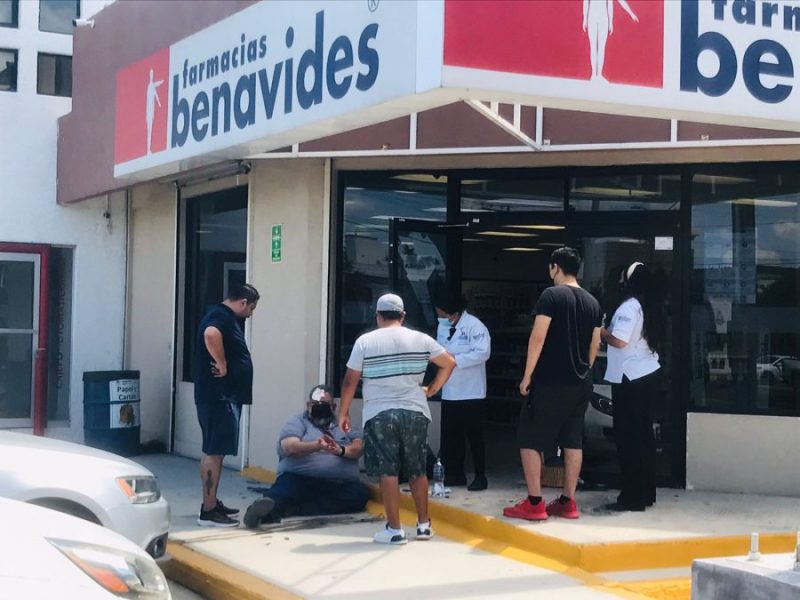 El hombre acudió a la farmacia a comprar medicamento para la presión, sin embargo, una mala pisada provocó que perdiera el equilibrio y se golpeara contra la puerta principal de la farmacia.