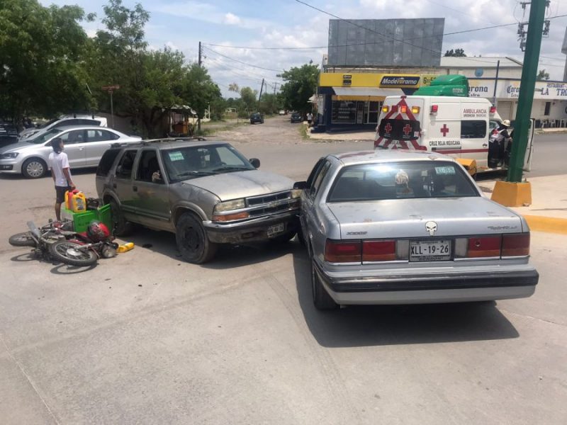 Un motociclista repartidor de una refaccionaria resultó con golpes leves esta tarde luego de impactarse con una camioneta cuya conductora se le atravesó y terminó chocando con otra unidad.