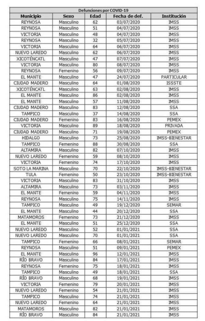 CIUDAD VICTORIA, Tamaulipas.- A poco más de 10 meses de confirmarse el primer caso de COVID-19 en el estado y tras esfuerzos sin precedentes en materia de prevención, la pandemia continúa registrando contagios a diario y fallecimientos que podrían aumentar al no respetarse las medidas sanitarias, advirtió Gloria Molina Gamboa.