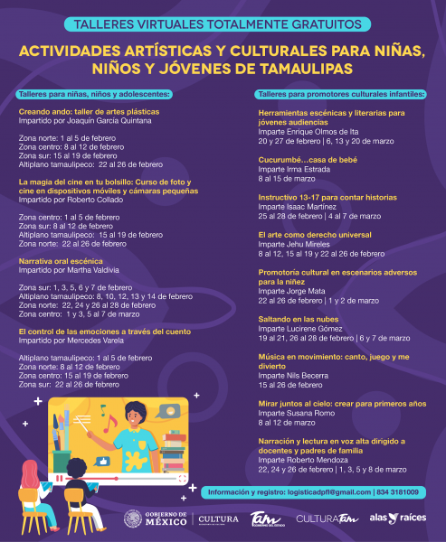 www.tinyurl.com/OfertaDeTalleres Para más información los invitamos a seguirnos en nuestras redes sociales de Cultura Tamaulipas. Facebook: Cultura Tamaulipas, Twitter: @CulturaTam e Instagram: Cultura_tamaulipas.
