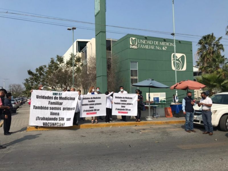 Un grupo de trabajadores de la salud del Hospital IMSS “San Luisito” protestó este día por que no fueron vacunados contra el Covid-19, pese a estar en la primera línea de batalla contra el virus y pese a la exposición diaria a la que se enfrentan.