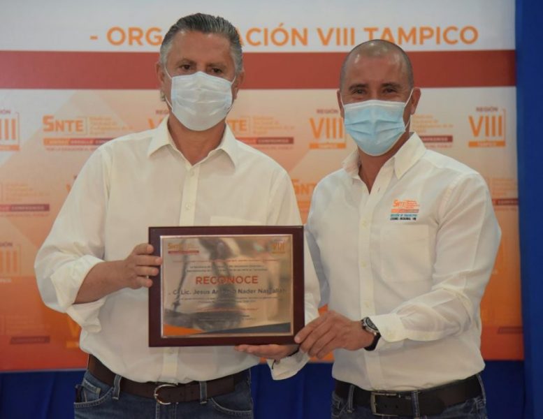 El Presidente municipal Chucho Nader recibió la tarde de este jueves, un reconocimiento por parte de la coordinación de Secretarios Generales del SNTE por el apoyo que la autoridad municipal ha destinado a la base magisterial de Tampico durante su administración.