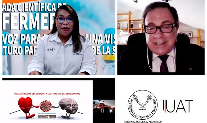En la primera conferencia, el Dr. José Ramón Martínez Riera, investigador de la Universidad de Alicante, España, presentó el tema “Estrés y agotamiento en la profesión de enfermería”, en el que describió las difíciles condiciones laborales en las que se desempeñan los profesionales de la enfermería, las cuales se han agudizado durante la pandemia de COVID-19.