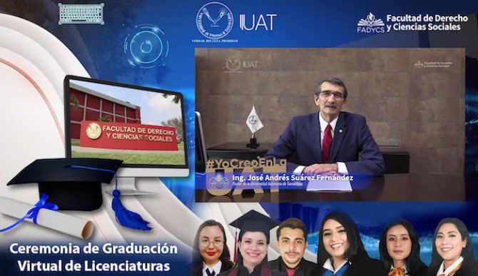El Rector de la Universidad Autónoma de Tamaulipas (UAT), Ing. José Andrés Suárez Fernández, presidió la ceremonia virtual de graduación de los programas de licenciatura y posgrado que imparte la Facultad de Derecho y Ciencias Sociales de Tampico (FADYCS).