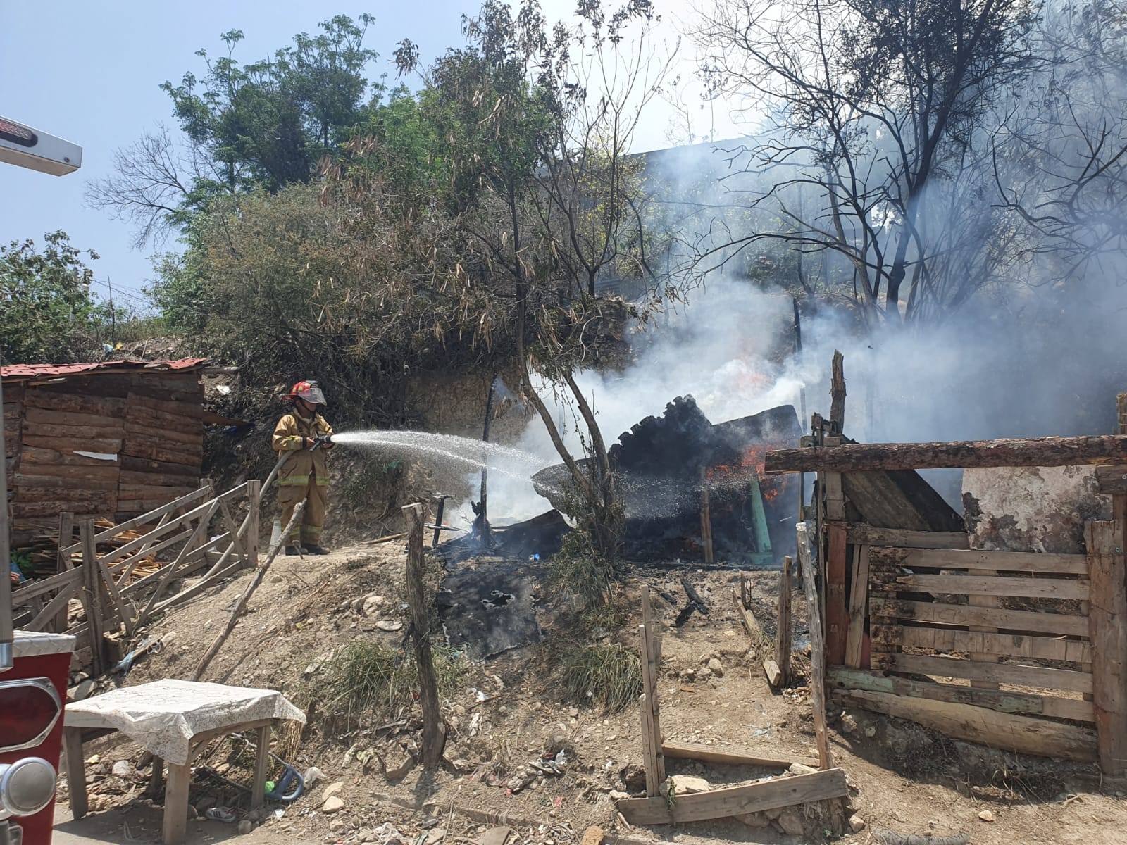 Una casa construida de madera y lámina quedó reducida a cenizas después de haber sido consumida por el fuego tras incendiarse, en la calle Camino del Pueblo y Ébano de la colonia Casas Blancas donde sucedieron los hechos.