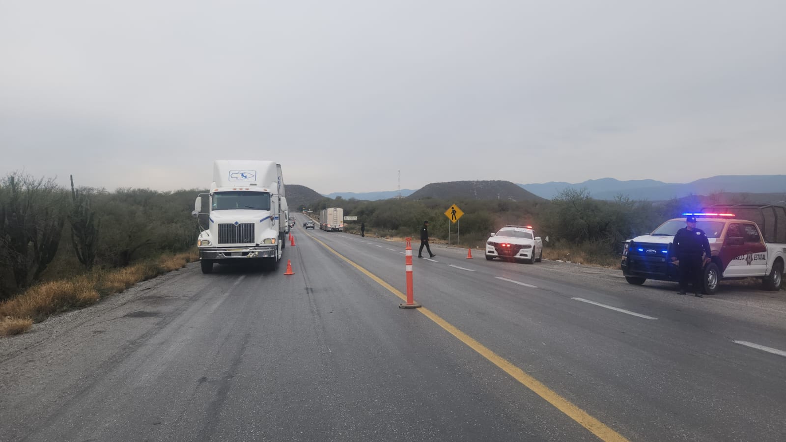 Personal de la Guardia Estatal de Apoyo Carretero comisionado a la Estación Segura Jaumave se encuentra en el área proporcionando seguridad vial y orientación a usuarios, a quienes se les recomienda utilizar vías alternas.