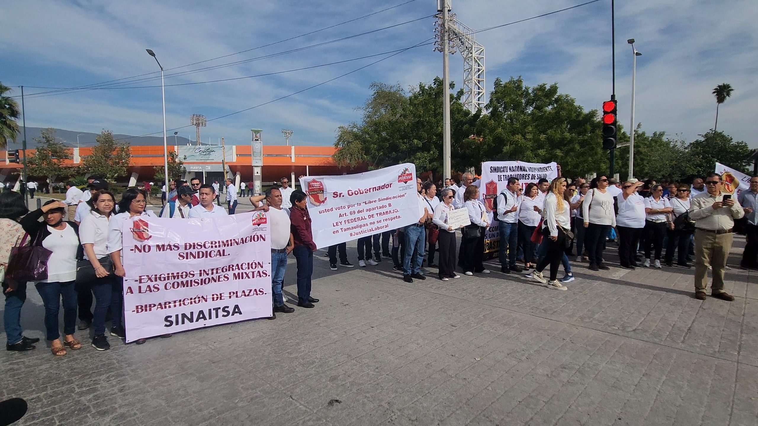 Mientras el gobernador de Tamaulipas Américo Villarreal Anaya, presidia la ceremonia de Honores a la Bandera en las instalaciones del patinadero en el 16 y 17 Carrera de Ciudad Victoria, un grupo de empleados del Sindicato Nacional Independiente de Trabajadores de Salud, se manifestaron con pancartas y con la exigencia de “piso parejo” para los sindicatos de salud en Tamaulipas.