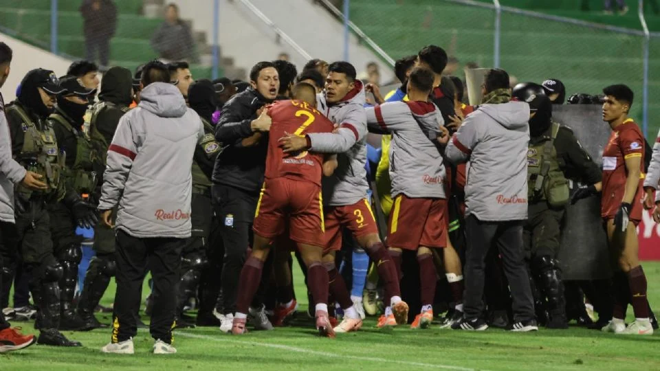 La transmisión de televisión reflejó que uno de los jugadores del equipo local fue al encuentro de otro jugador de Blooming para reclamarle, lo que forzó a que varios futbolistas visitantes trataran de calmarlo.